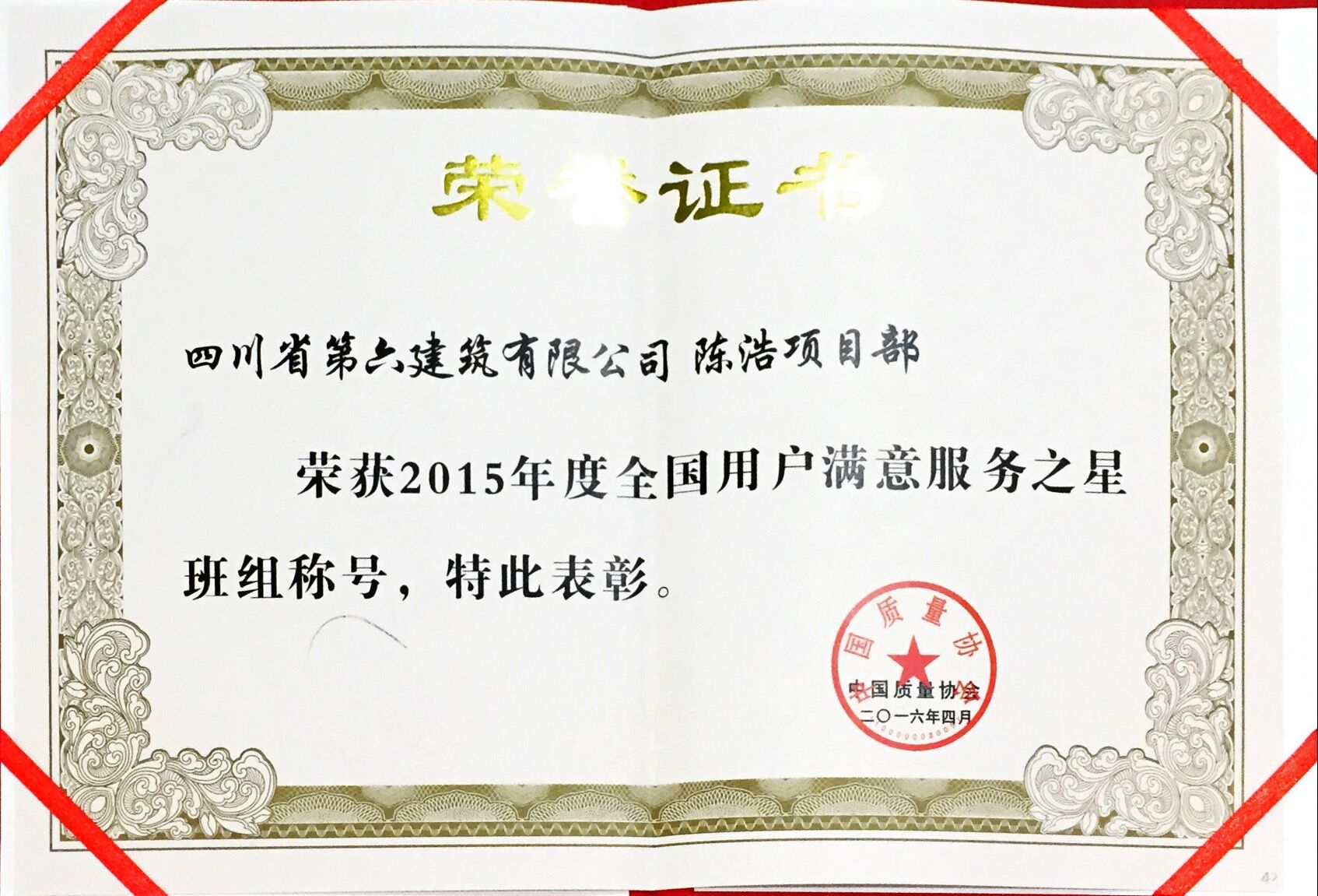 近日,從中國質(zhì)量協(xié)會、中華全國總工會、中華全國婦女聯(lián)合會聯(lián)合在北京召開的2015年創(chuàng)建“全國用戶滿意服務(wù)之星”交流大會上獲得喜訊,六公司二分公司少城國際項目部獲得“全國用戶滿意服務(wù)之星”班組的榮譽稱號。